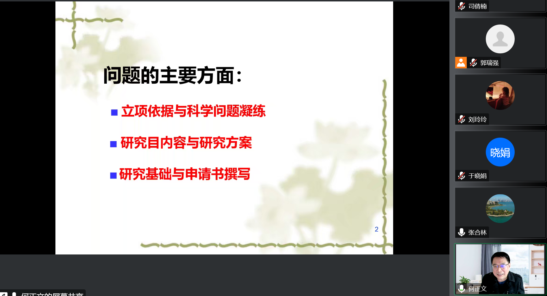 何正文教授将校级科研项目评审过程中发现的问题归纳总结为“立项依据与科学问题凝练”“研究内容与研究方案”“研究基础与申请书撰写”三个方面。在具体讲解中指出,要明确立项依据,注重项目现实背景和理论背景的进一步充实完善,突出研究问题在实际应用场景中的迫切性和可行性,通过全面系统地梳理整合相关学术理论,厘清研究间隙,高度提炼科学问题;要将研究问题分解细化,通过规范运用技术路线图、加强可行性分析与论证等方式,增强研究问题与研究内容、研究各子问题之间的关联性和逻辑性;要以研究团队及其科研成果为支撑,查缺补漏,不断完善,做好项目研究基础的规划,提升申请书撰写的整体质量。