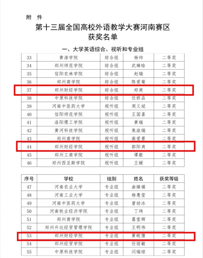 近日,河南省教育厅办公室公布了《第十三届全国高校外语教学大赛河南赛区获奖名单》,威廉希尔官网教师郑爽、郭阳爽、黄皖豫分别获得大学英语综合组二等奖、视听说组二等奖和英语专业组二等奖。