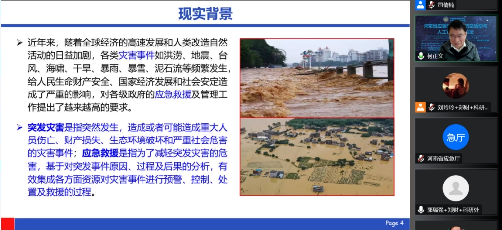 文天军在致辞中指出,洪涝灾害依然是人类面临的主要自然灾害,“7.20”特大暴雨对郑州及河南西部与北部地区的人身和财产安全造成了巨大损失,由此引发各类社会主体、组织机构对“应急与科技融合”“数字赋能安全应急”“拓宽安全应急思路”等议题展开深入思考与探索。当下,航空活动中人工智能、大数据、深度学习算法、移动协同等正被越来越多地应用于洪涝灾害预报和救灾减灾中,大大提升了灾害的预警准确率和人们的救援效率,这对保证人民群众生命财产安全、有效减少国家经济损失意义重大。期待本次论坛专家学者的精彩报告,共同为政府应急管理部门提高决策效率和执行效果建言献策。