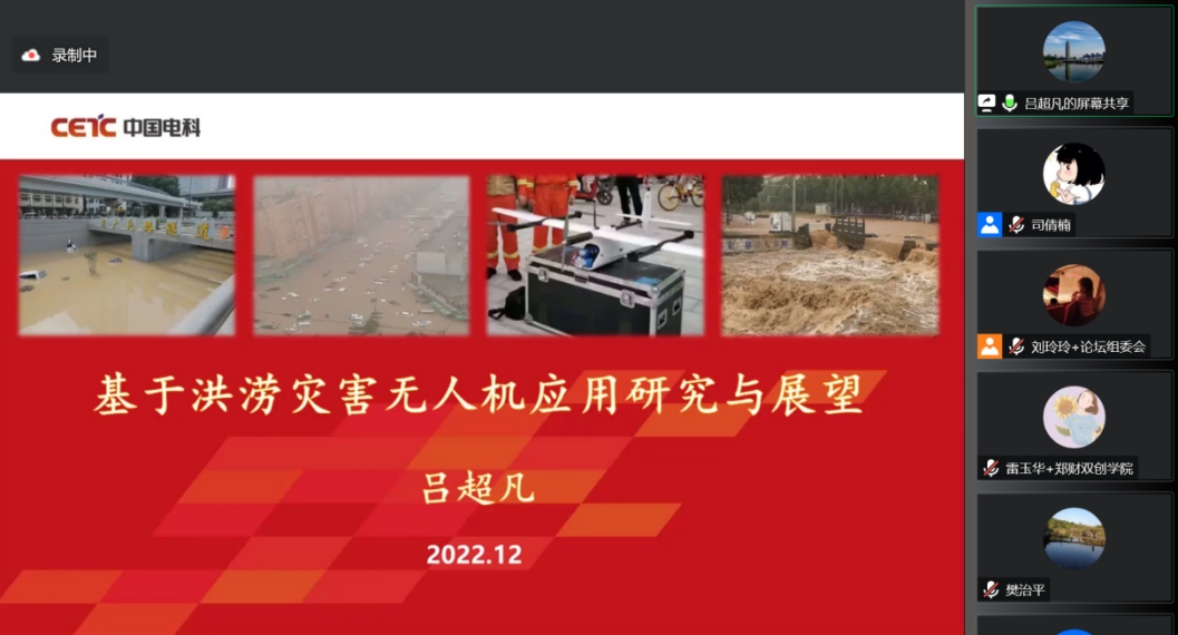 河南省航空业协会无人机专委会主任、中国电子科技集团公司第二十七研究所高级专家吕超凡作《洪涝灾害中无人机系统应用研究与展望》专题报告。他以我国近几十年遭遇的特大洪涝灾害为例,分析阐述了无人机应用于抗灾减灾的现实需求,回顾了无人机技术的发展历程,介绍了国内外无人机抗灾应用情况,指出要针对洪灾风险管理、备灾场景、应急场景、灾后救助场景等进行深入研究分析,进一步探索无人机在风险地区测绘、复杂水面巡逻、防洪堤坝排患、隧道内排查、通讯保障、定点投送等细分场景中的功用效能,发挥无人机集群特性,引领无人机技术向智能化、协同化、服务化方向发展。