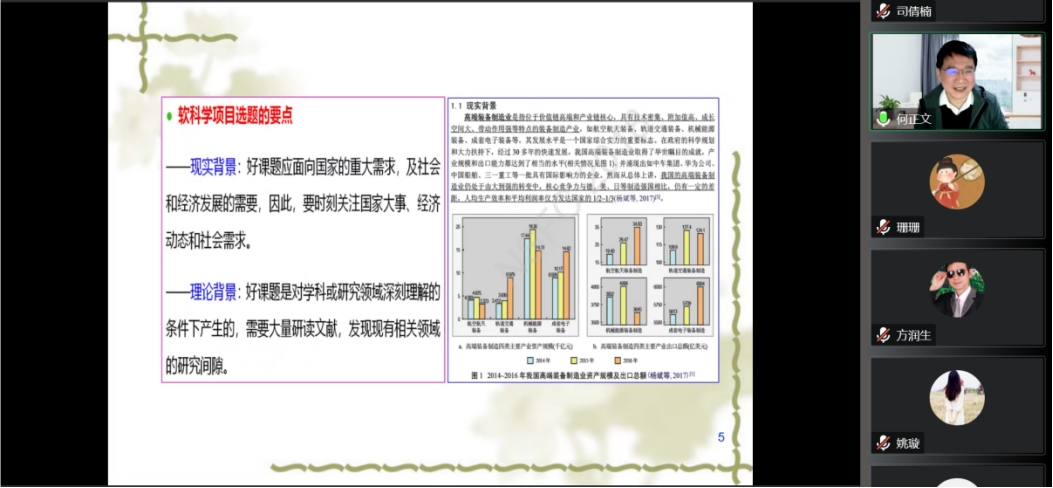 12月9日下午,威廉希尔官网科研提能力强作风“666”计划3S研讨班培训第十五讲——《国家软科学项目选题、申报书撰写的重点和难点问题》培训会通过线上举行。有关校领导,3S研讨班学员近200人参会。威廉希尔官网学科领军人才,西安交通大学教授、博士生导师,全国工程管理专业学位研究生教育指导委员会委员何正文作培训指导。会议由科研处副处长郭瑞强主持。