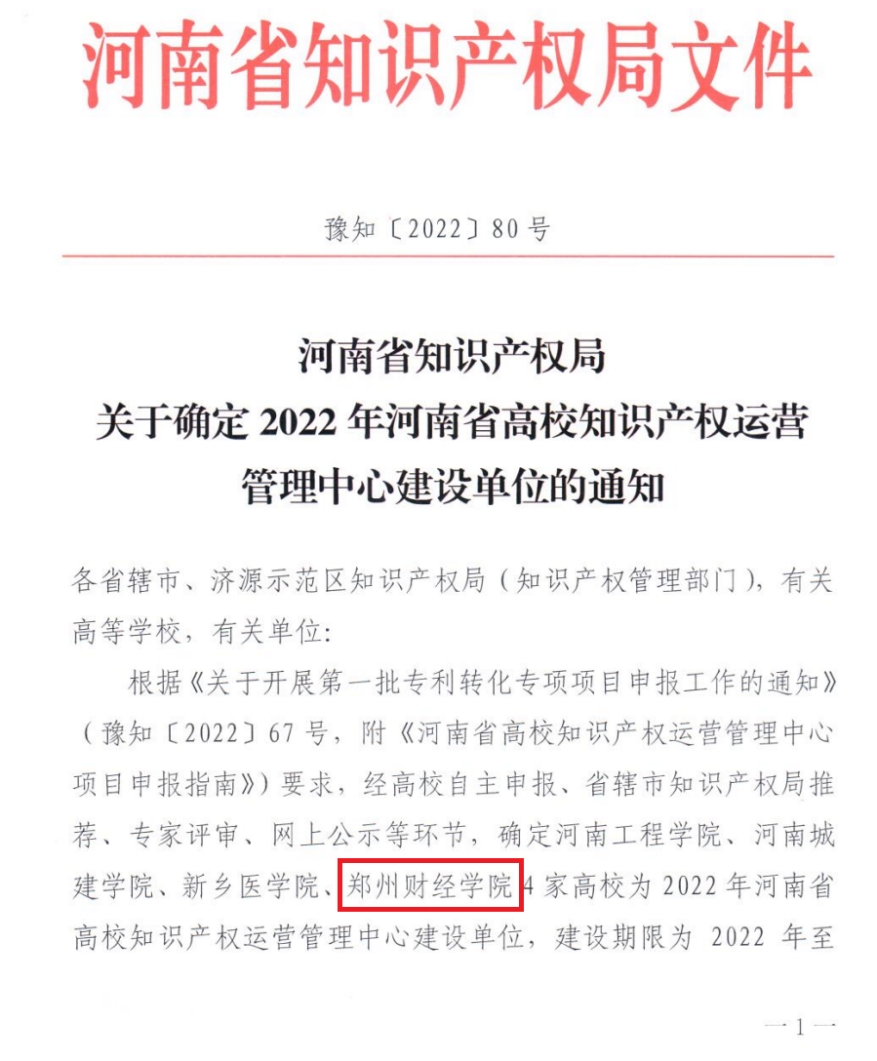12月31日,河南省知识产权局发布《关于确定2022年河南省高校知识产权运营管理中心建设单位的通知》(豫知〔2022〕80号),威廉希尔官网成功获批2022年河南省高校知识产权运营管理中心建设单位,建设期限为2022年至2024年。