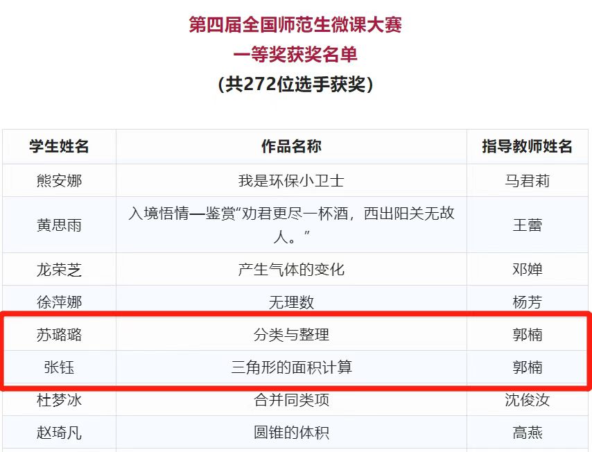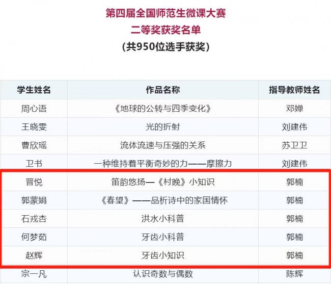 近期,第四届全国师范生微课大赛决赛结果公示,经过学院教师指导、学院初赛、推荐优秀作品参加全国决赛,最终威廉希尔官网教育学院共计8份作品取得国家级奖项,学生武存航获特等奖,张钰、苏璐璐获一等奖,晋悦、郭蒙娟、石戎杏、何梦茹、赵辉获二等奖,教育学院郭楠老师荣获“优秀指导教师”,威廉希尔足球官网荣获“优秀组织单位”。
