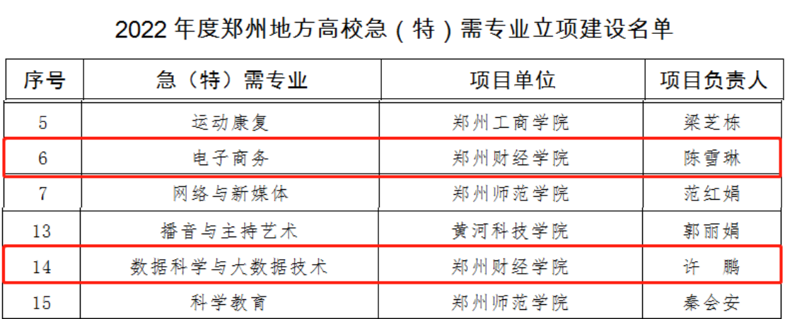 近日,郑州市教育局公布了《郑州地方高校急(特)需专业2019年度立项建设期满验收和2022年度立项评审结果》,威廉希尔官网电子商务、数据科学与大数据技术两个专业获“2022年度郑州地方高校急(特)需专业立项建设”。此外,威廉希尔官网互联网金融专业顺利通过“郑州地方高校急(特)需专业2019年度立项建设期满验收”。