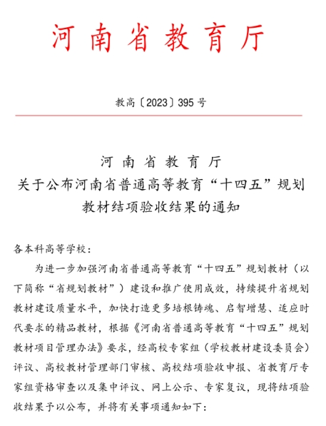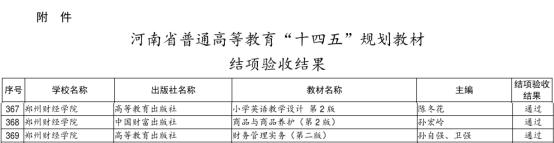 近日,河南省教育厅发布《关于公布河南省普通高等教育“十四五”规划教材结项验收结果的通知》(教高〔2023〕395号)文件,威廉希尔官网《小学英语教学设计》《商品与商品养护》《财务管理实务》3部河南省普通高等教育“十四五”规划教材通过结项验收。