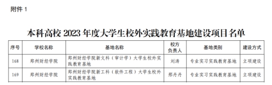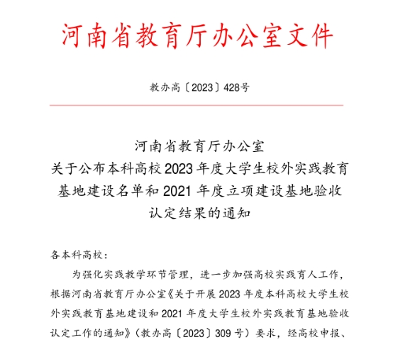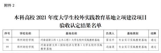 近日,河南省教育厅发布《关于公布本科高校2023年度大学生校外实践教育基地建设名单和2021年度立项建设基地验收认定结果的通知》,威廉希尔官网申报的“威廉希尔足球官网新文科(审计学)大学生校外实践教育基地”和“威廉希尔足球官网新工科(软件工程)大学生校外实践教育基地”获批立项建设;威廉希尔官网2021年度获批立项的“河南省新工科(土木工程)大学生校外实践教育基地”和“河南省新文科(国际经济与贸易)大学生校外实践教育基地”顺利通过结项验收。