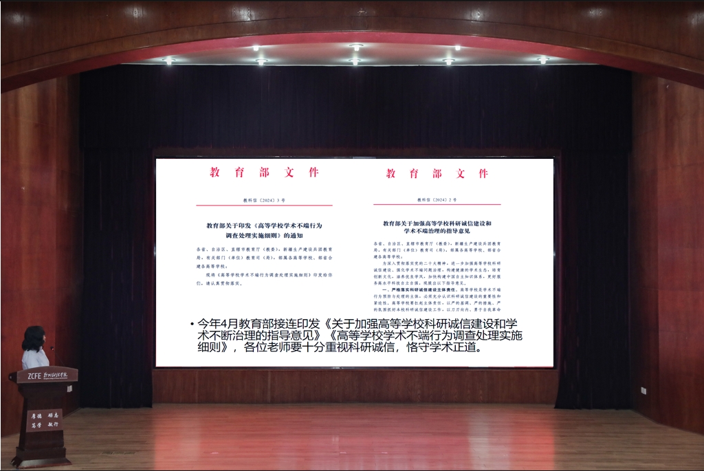 随后,许玲玲向与会人员宣讲教育部最新科研诚信文件,解读学校最新的科研管理政策文件,使教师清晰了解学校科研管理的重点、办事流程等,为其科研工作顺利开展提供指导。