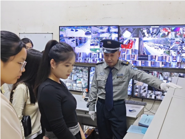 工作人员为学生讲解消防设备和监控设施