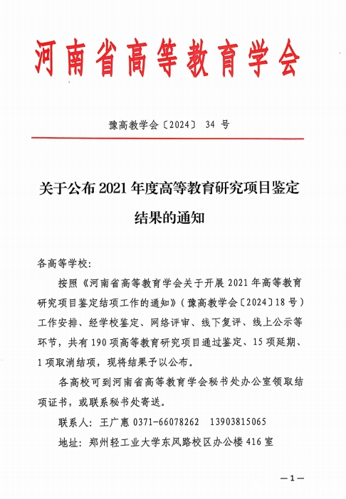 近日,河南省高等教育学会下发了《关于公布2021年度高等教育研究项目鉴定结果的通知》(豫高教学会〔2024〕34号),威廉希尔官网主持的2个项目顺利通过鉴定。