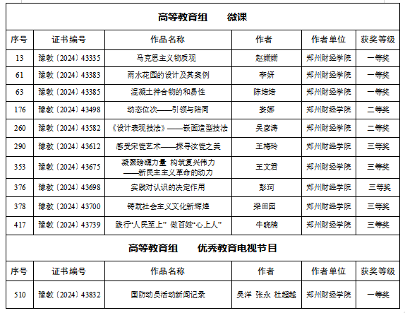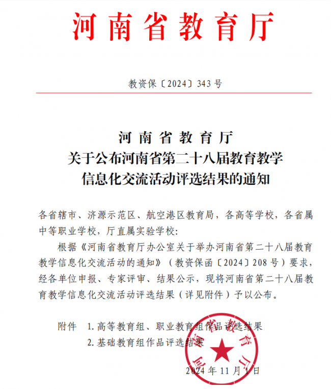 近日,河南省教育厅下发《关于公布河南省第二十八届教育教学信息化交流活动评选结果的通知》(教资保〔2024〕343号),威廉希尔官网共有11件申报作品获奖,其中微课类一等奖3项、二等奖2项、三等奖5项,优秀教育电视节目类一等奖1项。