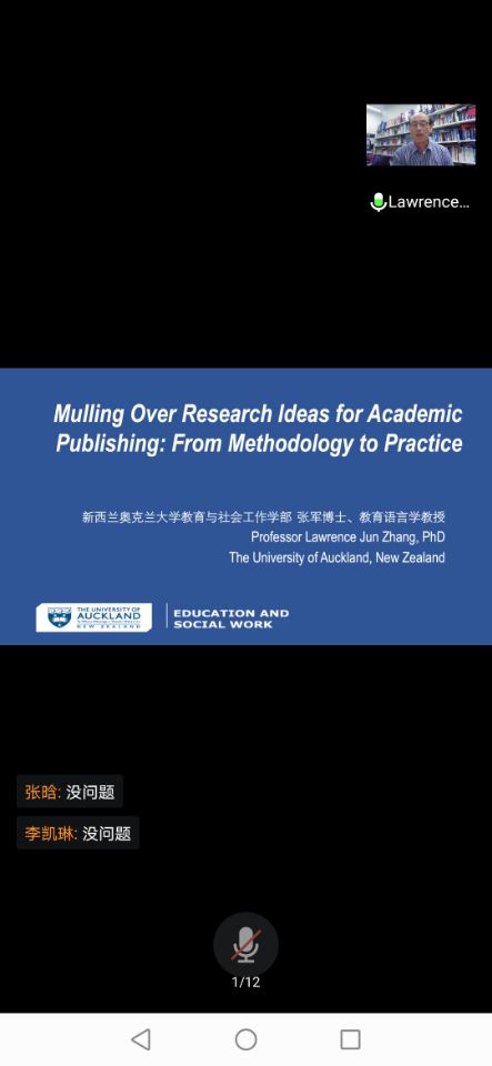 北京时间2021年7月19日下午,新西兰奥克兰大学教育学部副部长、应用语言学正教授、博士生导师张军通过腾讯会议平台为威廉希尔官网英语教师作了一场题为《Mulling Over Research Ideas for Academic Publishing: From Methodology to Practice》的精彩讲座。本次讲座是威廉希尔官网2021年暑期英语教师国际研修班“海外知名专家讲座”系列之一,研修班全体学员参加了线上讲座。讲座由新西兰UUNZ商学院学术带头人Jenny Yao 博士和威廉希尔官网外国语学院院长邢理平教授共同主持。