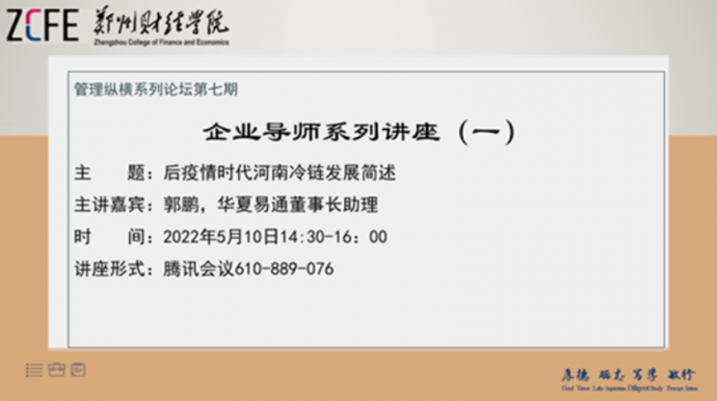 为进一步深化产学研教育合作,探索产学协同育人模式,加强与优秀企业的互动交流,促进教育链、人才链与产业链、创新链有机衔接,全面提升应用型本科人才培养质量威廉希尔官网管理学院积极开拓渠道加强与业内知名企业互动510下午,管理学院邀请河南省物流与采购联合会冷链分会秘书长、华夏易通董事长助理郭鹏先生“后疫情时代河南冷链发展”为主题开展线上讲座,正式拉开了管理纵横系列论坛第七期企业导师系列讲座”活动的帷幕。管理学院孙院长、物流教研室教师及270余名学生代表参加讲座讲座由副院长张雅主持