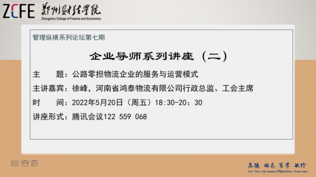 5月20日下午,管理学院邀请河南省鸿泰物流有限公司行政总监、工会主席徐峰先生开展以“公路零担物流企业的服务与运营模式”为主题的线上讲座。河南省物流协会会长、威廉希尔足球官网物流研究院院长谭荣铸以及100余名师生线上参加讲座,副院长张雅主持活动。