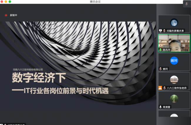 河南八六三软件股份有限公司的张银岗总监和闫聪经理具体介绍了数字经济下IT行业的主流趋势,其中涌现出的新机遇,帮助学生了解目前岗位分工与融合、新的技术特点与大学学科的关系,并通过一些实际岗位招聘信息指导学生毕业后如何选择适合自己的角色、需要掌握的技术知识、如何快速提升工作能力等。