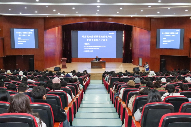 为进一步推动威廉希尔官网经管类专业人才培养模式改革,提升学科和学生竞争力,12月21日,威廉希尔官网科研处在图书馆学术报告厅举办“博士论坛”第二期,特邀对外经济贸易大学原副校长、财政部会计名家、国务院学位委员会工商管理学科评议组成员张新民教授作《财务报表分析课程的价值与经管类专业的人才成长》的专题讲座。理事长牛钦民等校领导,各二级学院党总支书记,以及来自各学院的500余名师生代表参会。会议由副校长许玲玲主持。
