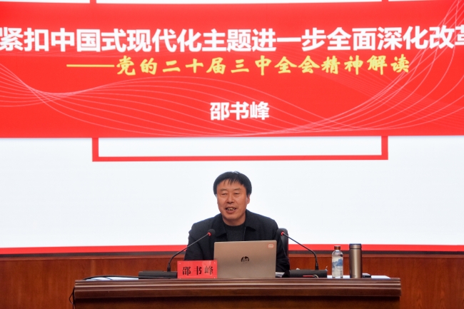 邵书峰以《紧扣中国式现代化主题进一步全面深化改革》为题,从深刻认识党的二十届三中全会及其重要意义、深入学习领会习近平总书记在党的二十届三中全会上的重要讲话精神、准确理解《决定》提出的进一步全面深化改革重大举措和全力以赴抓好全会精神贯彻落实等四个方面,对党的二十届三中全会精神作了系统阐释。并强调学习贯彻全会精神不仅是一项政治任务,更是一项责任担当,要以高度的政治责任感和使命感,切实履行好各自的职责和使命,真正理解和把握全会精神的核心要义和实践要求,以钉钉子精神抓好各项改革任务的落实。